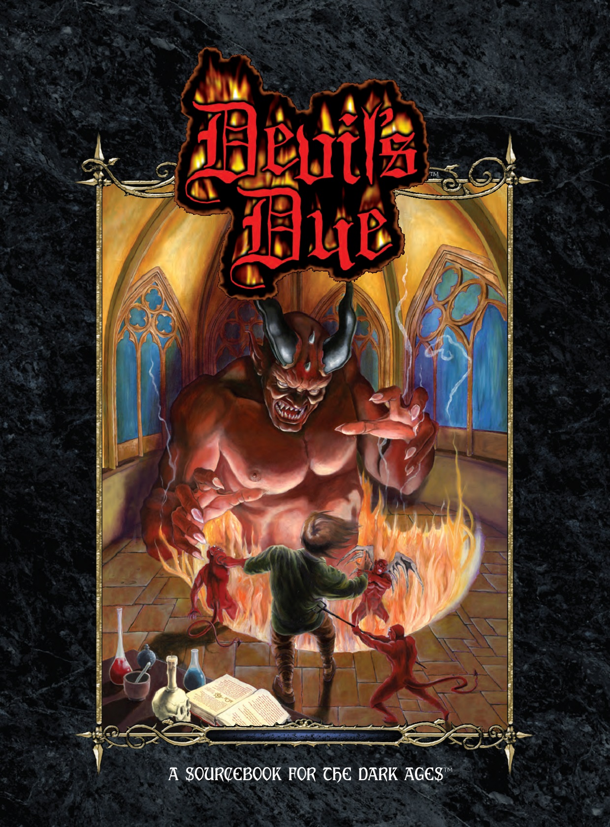 Devil's Due serves as the guide to demons and infernalists for the Dark Ages game line. This book expands upon and supersedes the brief information presented in Dark Ages: Vampire,[1] showing a close look at the host of Hell and their history stretching back to the very beginning of the universe. While the book serves as an excellent resource for integrating infernal supporting characters and antagonists into ongoing Dark Ages chronicles, it also presents the possibility of playing these fallen angels or their wretched slaves as the protagonists of their own stories.