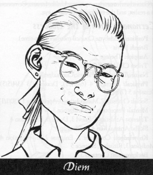 Diem is an accomplished photographer. He often travels to the outback, where, using a combination of his skills and Garou abilities, he takes spectacular photographs. Diem serves Gaia by printing these photographs and showing humanity the beauty of Her creations. He is responsible for many of the pictures, whether of whales or desert landscapes, that hang in suburban homes, schools, corporate offices, etc., across the nation. It is a private joke of Diem's that the picture hanging in Pentex's Sydney reception room is a photo of Mamu, leader of the Red Talons, sleeping in Lupus form beneath a boab tree.
