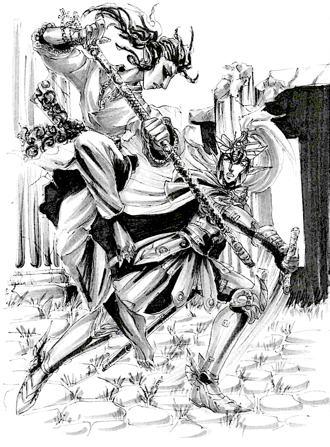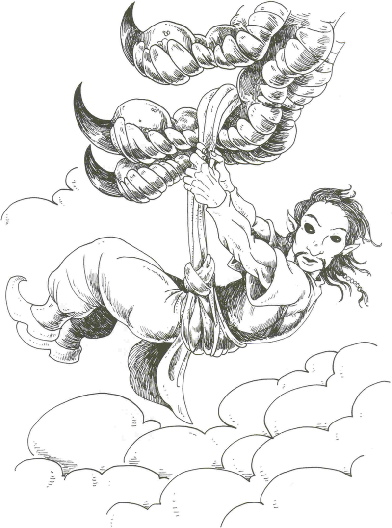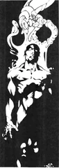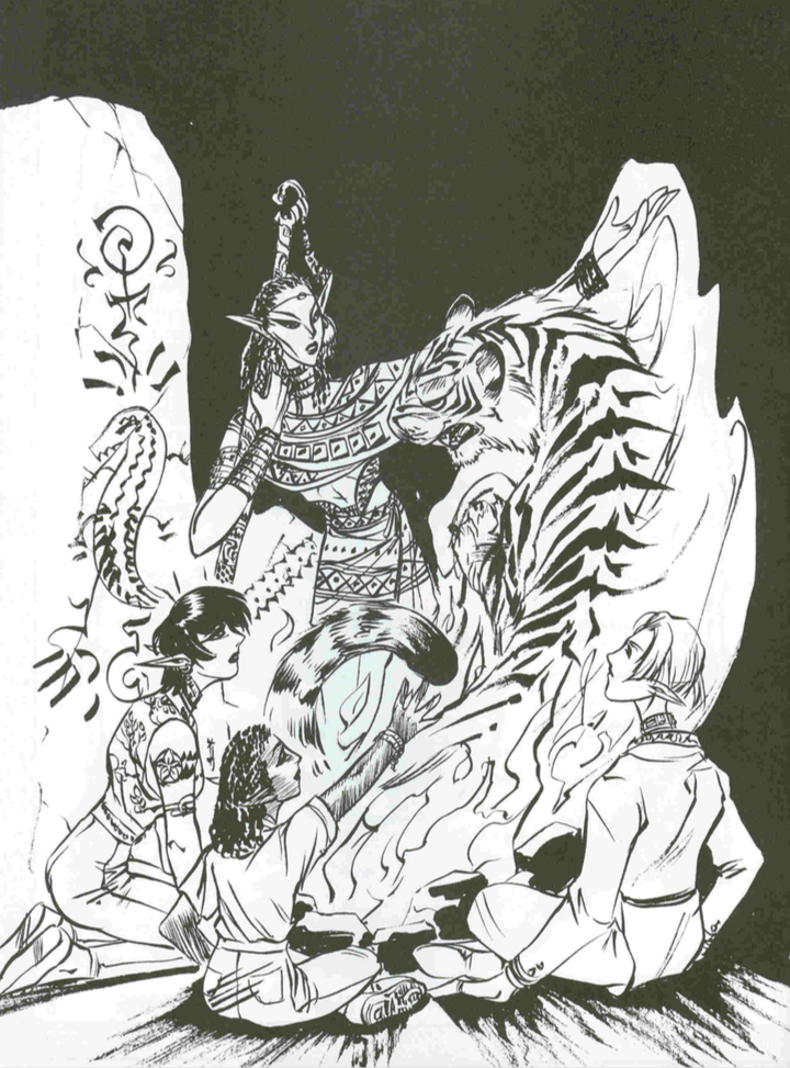 He thought for days and nights until he had the punishment just right, then called all his children to him. One group of them, though, fearing punishment, fled into hiding and preyed upon the weak to keep themselves alive. These cowards became the first Aithu. They didn't hear the words of Eshu. And what did Eshu tell his children? A great and powerful secret, the first hidden lore the Tribe was entrusted to keep. From that day forward they became the Elegbara, the chosen children of Elegba Eshu the Powerful Knife, keepers of his sacred places and his messengers to the world. He solemnly commended them to follow his footsteps well; wandering the roads, learning secrets, and testing those they came across. And with that he blessed them and kissed each one to seal his magic in them, then flew into the sky laughing.