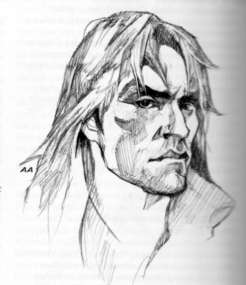 In Urhan form, Call is a black wolf, with white "socks." A long streak of white fur has grown along his side over the scar from the Predator Kings' claws. In human form, he's a tall white man, with unruly black hair that hangs down to the middle of his back. He rarely smiles anymore, and not even the joy of battle can thrill him.