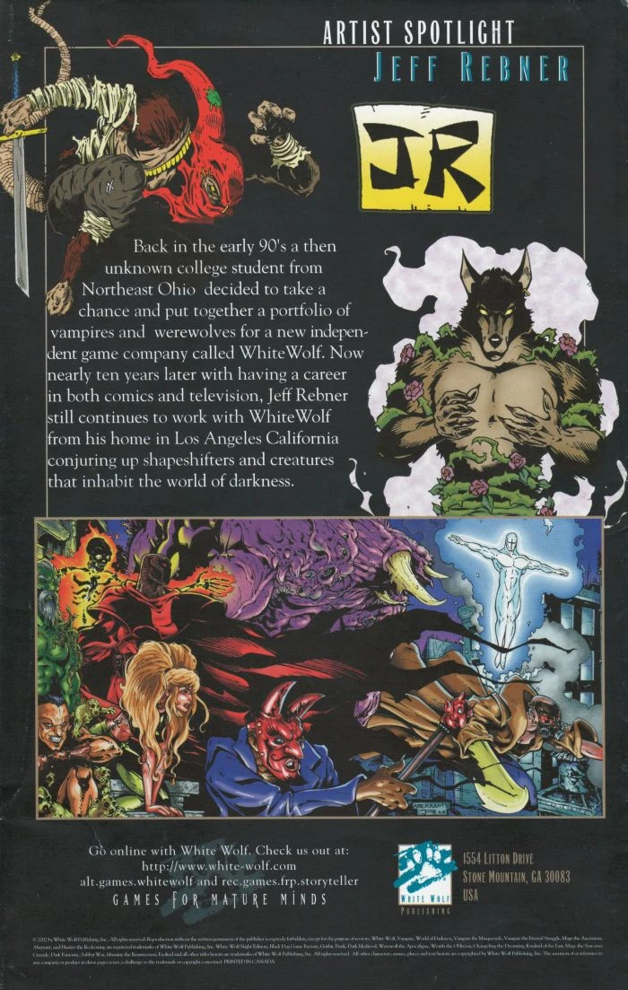 Back in the early 90's a then unknown college student from Northeast Ohio decided to take a chance and put together a portfolio of vampires and werewolves for a new independent game company called White Wolf. Now nearly ten years later with having a career in both comics and television, Jeff Rebner still continues to work with White Wolf from his home in Los Angeles California conjuring up shapeshifters and creatures that inhabit the world of darkness.
