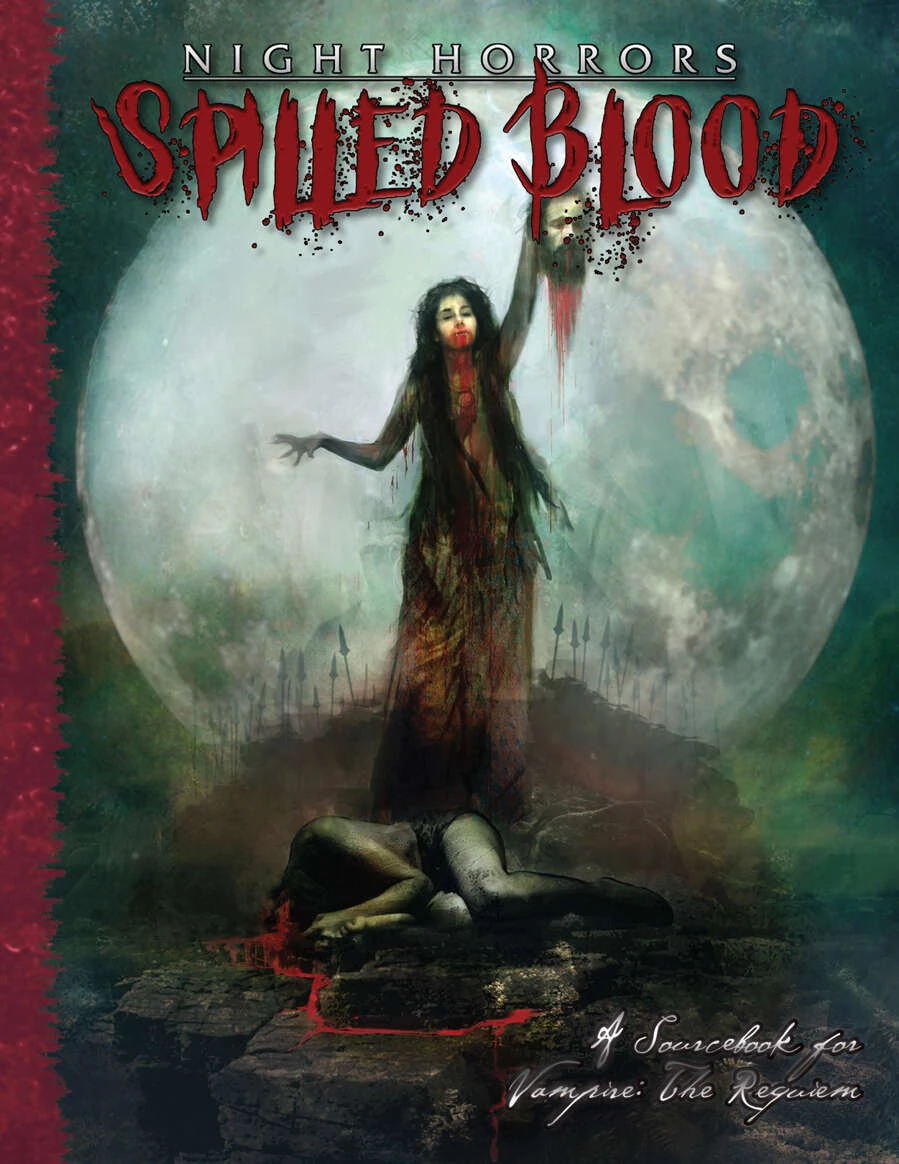 Night Horrors: Spilled Blood is a sourcebook for Vampire: The Requiem that provides new bloodlines and lost clans, as well as non-Kindred antagonists.