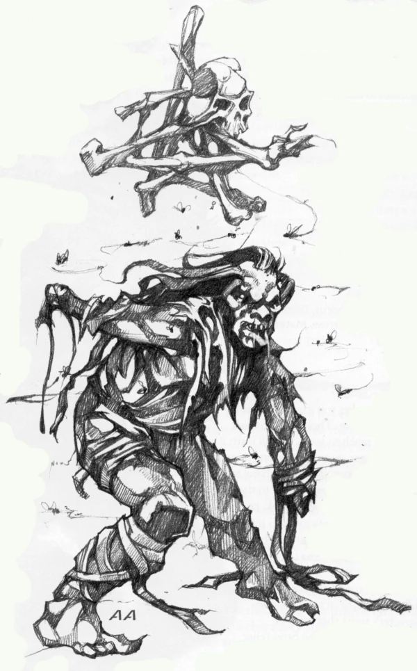 A murs'thu appears as a handful of spongy and diseased shards of bone rotating within a buzzing cloud of flies. Filthy bandages dangle from within the spirit, dragging on the floor where it passes. Wastelings always choose ailing individuals to spread their influence.