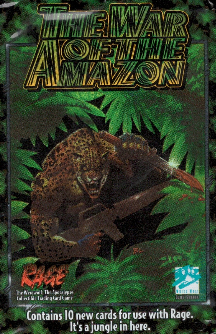 "War of the Amazon is a 140-card expansion set detailing werewolves' epic battle to save the Amazon Jungle. Players use their packs of Garou to protect Gaia from the machinations of Pentex, or play packs of Wyrm creatures that aim to defile and lay waste to the Amazon. The introduction of the Mokolé and Bastet, two new races of shapeshifters, brings a fresh collection of exotic and potent characters to both Wyrm and Garou packs."