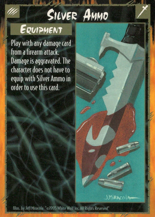 It’s difficult to fashion a weapon out of silver, but a skilled blacksmith or gunsmith can make such a weapon. Those who know of the Garou’s existence know to keep silver weaponry close. Some items can be plated with silver, rather than being made entirely of silver. These items deal damage as though they were silver weapons, but the plating is ruined after a couple of blows.